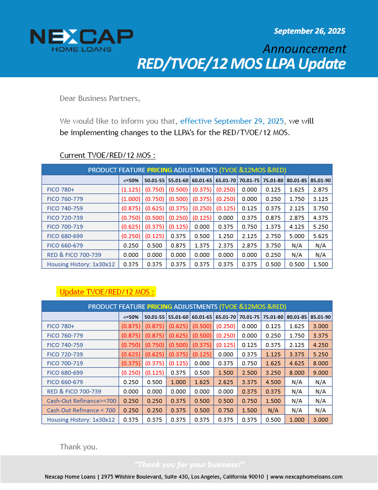 RED/TVOE/12 MOS LLPA Update